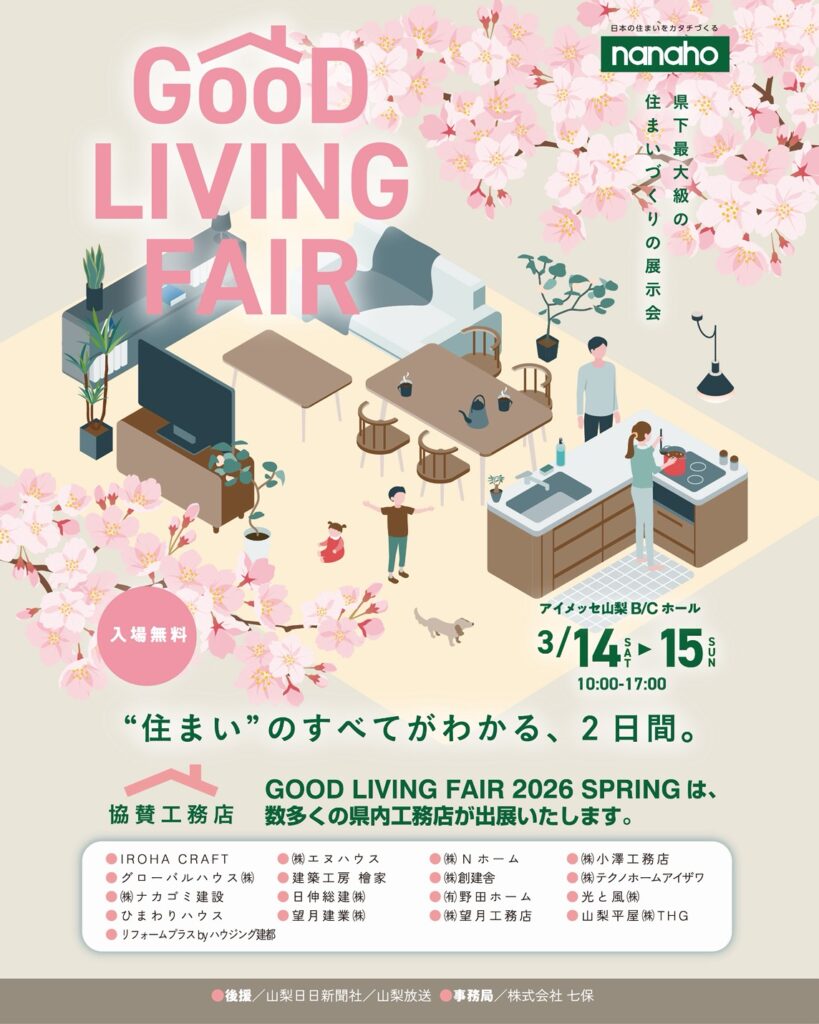 2026年3月14日(土)・15日(日)の2日間、アイメッセ山梨で開催される「七保グッドリビングフェア2026春(GOOD LIVING FAIR 2026 SPRING)」にエヌハウスも出展します!